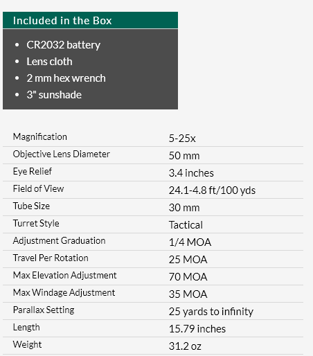 The Viper PST Gen II Rifle Scope hands an unfair advantage to shooters who seek to keep the upper hand in every situation from close quarters to long-range shots. The illumination dial is cleanly integrated into the side focus adjustment knob for easy access and streamlined performance. The glass-etched reticle offers shooters highly functional, intuitive, and detailed hold points, yet remains uncluttered for optimal viewing and features 10 intensity levels with off positions between each setting.